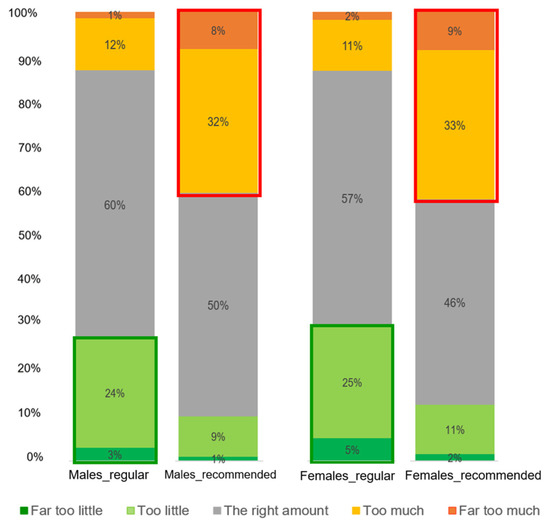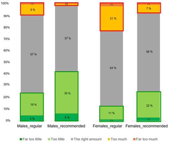 There was a clear distinction between males and females in the perception of the amount of meat (Figure 4). A significant difference was found in the proportions of how men and women perceived the amount of meat in the regular portion sizes (X2 (4, N = 1290) = 62.9, p < 0.001). It was observed that more men than women perceived the amount of meat in the regular portions to be “The right amount”. In addition, regarding the recommended portion, a significant difference was found in the proportions of how men and women perceived the amount of meat in the recommended portion sizes (X2 (4, N = 1290) = 60.7, p < 0.001). It was observed that more women than men perceived the amount of meat in the recommended portions to be “The right amount”; on the other hand, more men than women perceived the amount of meat in the recommended portions to be “(Far) too little”.