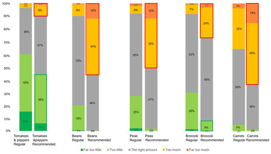 Figure 5. Bar plots of the perceived amount of vegetables (from “far too little” to “far too much”) in the regular and recommended portions of each of the five meals.