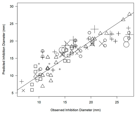 3.3. Inhibition Diameter as a Function of MIC, Extract Dose, and Bacterium