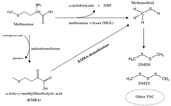The production of MTL is generally associated with the one-step degradation of methionine by MGL; however, it can also originate in a two-step degradation pathway through two other enzymes, aminotransferase and α-keto-γ-(methylthio)-butyric acid demethiolase [80]. A study on the enzymatic pathways of methionine degradation to methanethiol in Actinomycetes bacteria isolated from ripened cheese found that the Arthrobacter sp. strain produced MTL, DMDS, and DMTS from both methionine and α-keto-γ-(methylthio)-butyric acid (KMBA) by enzymatic conversion through one-step and two-step degradation pathways, respectively [77]. The possibility of the enzymatic degradation of methionine via both pathways is shown in Figure 1 In addition, the ability of smear cheese-ripening bacteria to produce VSC from methionine is possibly influenced by cysteine as it appears likely that part of methionine can be converted into cysteine by the transsulfuration pathway through two major enzymes, i.e., cystathionine γ-synthase (CGS) and cystathionine β-lyase (CBL) [81]. CGL has been identified in bacteria as being responsible for hydrogen sulfide (H2S) while CBL releases homocysteine from cystathionine, which can either be involved in the biosynthesis of methionine or hydrolyzed by the CGL resulting in the production of H2S. Consequently, these two enzymes could reduce the amount of methionine, which would reduce VSC production [82]. The reduction of methionine catabolism by cysteine in Arthrobacter spp. could be caused by a reduction in MGL activity due either to a direct effect of high concentrations of cysteine or to other enzymes [74]