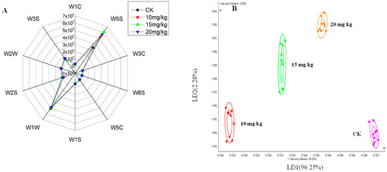 (A) Radar chart and (B) linear discriminant analysis (LDA) of fresh oriental melon after forchlorfenuron application obtained by E-nose measurement. CK: pollination group; 10 mg/kg: low-dose forchlorfenuron application group; 15 mg/kg: mid-dose forchlorfenuron application group; 20 mg/kg: high-dose forchlorfenuron application group.