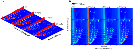 Volatile flavor compounds in fresh oriental melon after pollination or forchlorfenuron application: (A) a three-dimensional spectrum of the HS-GC-IMS response data; (B) a two-dimensional spectrum of the HS-GC-IMS response data.