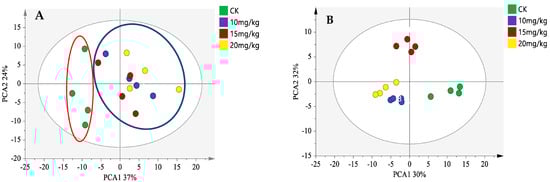 To better understand the effect of volatile compounds in fresh oriental melon after forchlorfenuron application, the difference comparison model was applied to compare the differences between the different treatment groups. The topographic plot of fresh oriental melon from the pollination group (CK) was selected as a reference, and the spectrum of the other samples deducted the reference. If the volatile compounds were consistent, the background after deduction was white; red and blue indicated that the concentration of volatile compounds was higher and lower than the reference, respectively. As shown in Figure 3A, the number of red dots increased gradually with the increase in concentration of the forchlorfenuron application (10–20 mg/kg). Moreover, more red spots were observed for the mid-dose (15 mg/kg) and high-dose (20 mg/kg) groups. Further, several blue spots can be observed in the three forchlorfenuron application groups, indicating that the concentration of several volatile compounds in the three forchlorfenuron application groups was lower than in the pollination group (CK).