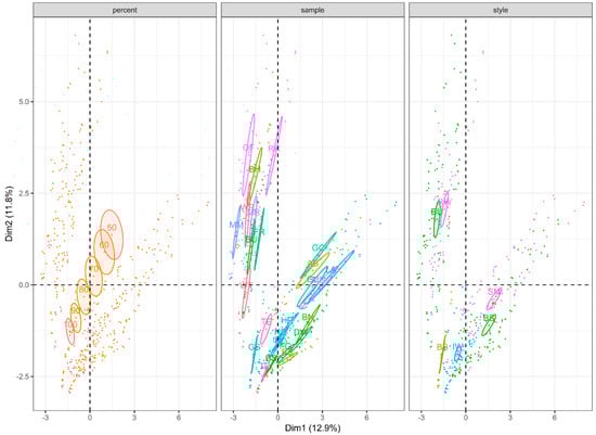 A total of 24.7% of the variance is represented in the first two principle components (PC1 = 12.9% and PC2 = 11.8%). Confidence ellipses were distinct (non-overlapping) for 100, 90, and 80% whisky dilution levels. Starting at the 70% whisky dilution level differences became less distinct, with confidence ellipses overlapping between 70 and 60% whisky as well as 60 and 50% whisky. Whisky styles were significantly different, with principle component 1 separating blended Scotch (BS) and single malt Scotch (SM) from Bourbon (BU) and principle component 2 separating rye whiskey (RW) and Bourbon (BU) from barrel-strength Bourbon (BB) and Irish whiskey (IW). Individual samples (whisky brand) show some differences and similarities based on 95% confidence ellipses.