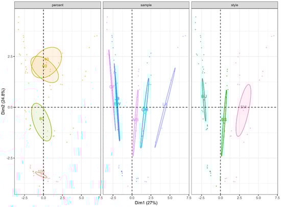 Simultaneous chromatogram deconvolution of HS-SPME-GC-MS data was performed using non-negative PARAFAC2 modeling software (PARADISe v5.9, University of Copenhagen, Copenhagen, Denmark) []. Tentative compound identifications were acquired using NIST MS Search (v2.4, National Institute of Standards and Technology, Gaithersburg, MD, USA) using the NIST20 library. Statistical analyses were performed in R (v4.2.1) using RStudio (v2021.09.0 build 351, RStudio, Boston, MA, USA) and the FactoMineR, factoextra, and mixOmics packages. For the larger dataset of 25 assorted whiskies, 91 volatile compounds were tentatively identified and separated in to eight compound classes (Supplemental, Table S1). For the smaller dataset of whiskies used for sensory analysis, 131 volatile compounds were tentatively identified and similarly separated in to 11 compound classes (Supplemental, Table S2). Compound classes were used for multifactor analysis (MFA) in R. These classes were roughly chosen according to the types of compounds present. For example, ethyl esters are generally produced during fermentation by Saccharomyces cerevisiae [] and were subsequently grouped together, as were PAHs and benzofurans which notably stem from peat smoke exposure during the malting process in Scotch whisky production [].