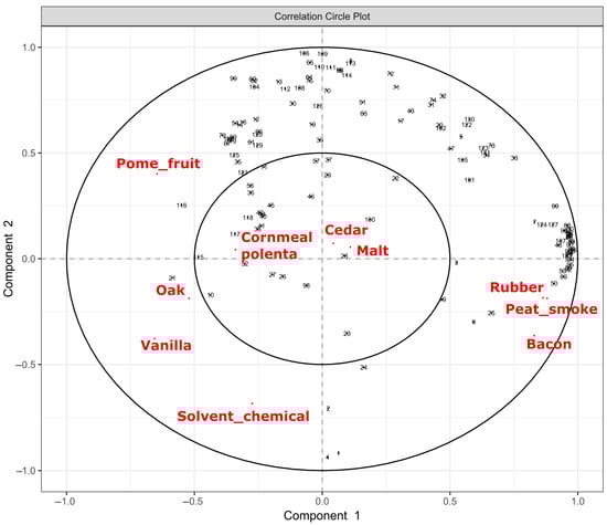 Partial least squares (PLS) variables plot of sensory attributes and their associated chemical compounds. A total of seven sensory attributes were found to be statistically significant (“Solvent/Chemical”, “Vanilla”, “Oak”, “Pome Fruit”, “Peat Smoke”, “Bacon”, and “Rubber”) while three were not (“Cedar”, “Malt”, and “Cornmeal/Polenta”).