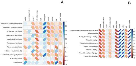 Correlograms of “acetate ester” (A) and “phenol” (B) compound classes with sensory attributes. Irregularity of ellipsis shape corresponds to the correlation coefficient while color represents positive/negative correlation (red = negatively correlated, blue = positively correlated). Volatile compound data were measured in triplicate by HS-SPME-GC-MS and tentatively identified using the NIST 2020 library, triplicate measures were averaged for comparison. Sensory attributes are averaged duplicate measures recorded by trained descriptive analysis (DA) sensory panel (n = 20).