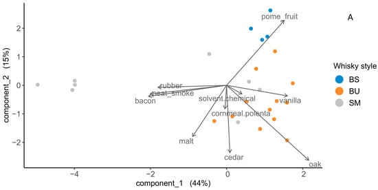 Partial least squares discriminant analysis (PLS-DA) biplot of sensory attributes and whisky styles (A) and dilution factor (B). In general, smokey terms (“Rubber”, “Bacon”, and “Peat Smoke”) were associated with peated single malt Scotch whisky (SM), “Vanilla” and “Oak” were associated with Bourbons (BU), and “Pome fruit” was associated with unpeated, blended Scotch whisky (BS). Undiluted whisky more directly correlated with “Solvent/Chemical”, “Vanilla”, “Bacon”, and “Oak” aromas while heavier dilution favored “Pome fruit”, and “Cedar” attributes.