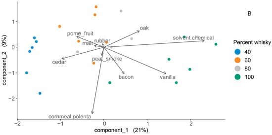 Overall effects of whisky dilution with water on aroma are best exemplified in the PLS-DA analyses of the sensory data (Figure 5). Bourbon and rye whiskies, which by law are aged in first-use charred American oak, were heavily associated with “Oak” and “Vanilla” aromas, which are common descriptors for some of the most aroma-active compounds typically found in Bourbons (volatile phenols) []. As mentioned previously, these phenols are introduced through the oak charring process, where thermal degradation of lignin results in the release of phenol monomers []. The decrease in “Vanilla” aroma with dilution shown in Figure 5B would be expected due to the amphipathic nature of phenols such as vanillin and guaiacol (logP values around 1, []), as well as general dilution effects. Alternatively, “Oak” aroma appears to evolve into a “Cedar” aroma with dilution, possibly due to the hydrophobic nature of many of the oak lactones found in Bourbon which are often described as “raw wood” or “pencil shavings” []. “Pome fruit” was associated with single malt Scotch style whiskies and acetate esters. These esters are derived from acetic acid and fusel alcohols, which were also notably higher in single malt Scotch style whiskies and tend to provide “fruity” aromas []. They are also relatively hydrophobic compounds with logP typically greater than 2 [], which suggests they are more likely to be repelled by water into the headspace above the sample. The evolution of aromas with dilution is also likely a factor of certain constituents of the overall aroma falling below recognition and/or detection thresholds as the sample matrices are changed [].