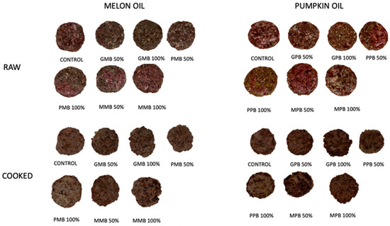 Sensory analysis is a useful tool used to identify the changes originated by the substitution of ingredients based in the preferences of consumers [49]. When the affective test was performed with the burgers elaborated with melon and pumpkin oils, in all cases, and for all the parameters evaluated, the mean values by the consumer judges were above 0, which means that the acceptability of the burgers was in all cases in values of ‘I like’. The samples evaluated are shown in Figure 1.