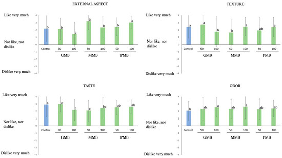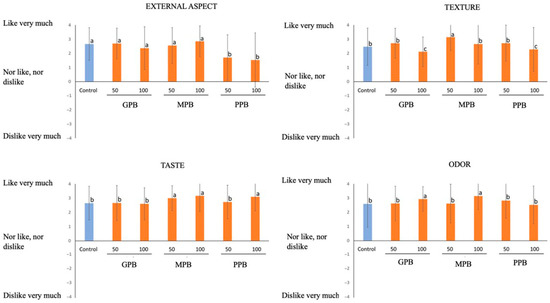 Results obtained in sensory evaluation of reformulated burgers with pumpkin oil. Different letters in the columns show significant differences (p < 0.05). Control: Deer meat (78.8%), pork fat (19%), corn-starch (1.4%), spices (0.8%); GPB 50: Pork fat (9.5%), gel emulsion (9.5%); GPB 100: Gel emulsion (19%); PPB 50: Pork fat (9.5%), particle emulsion (9.5%); PPB 100: Particle emulsion (19%); MPB 50: Pork fat (9.5%), maltodextrin emulsion (9.5%); MPB 100: Maltodextrin emulsion (19%). The rest of ingredients in the burgers are the same as the control.