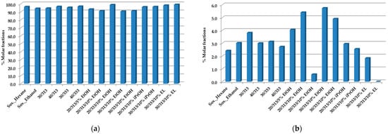 With regard to the DAGs, and particularly the case at 20 MPa, 333 K, and scCO2 + 10% ethanol, a lower value was achieved. The maximum % molar fraction was obtained with ethanol as the co-solvent under the other extraction conditions.