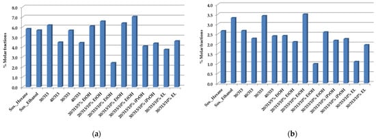 Caffeine (a) and cafestol (b) composition of spent coffee oils obtained by Soxhlet with hexane, ethanol, and scCO2 extraction at a flow rate of F = 1.8 × 10−3 kg·min−1, as established by 1H-NMR quantitative analysis [50]. All values represent % molar fractions.