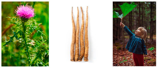 Arctium lappa is known by many names in different countries—edible burdock, beggar’s buttons, niúbàng in China, gobo in Japan, bardana in Brazil, repei in Bulgaria, etc. It has been extensively cultivated for over 3000 years in Asia and has been used as a nutritious vegetable in a variety of dishes. For centuries, burdock has been an important part of traditional Chinese medicine—e.g., root–water infusions have been widely applied as a diuretic, a laxative, and an antiseptic as well as to treat skin problems and external wounds and to increase male potency [55]. In medieval Europe, burdock roots were also used as a vegetable, but its popularity has since declined substantially. At present, the leaves and young shoots are consumed as a vegetable, while in Great Britain, a popular carbonated soft drink named “dandelion and burdock” has burdock roots as one of its two main ingredients.