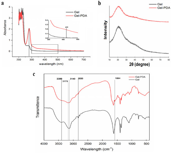 An ultraviolet–visible (UV–Vis) spectrometer (Beijing Persee General Instruments Co., Ltd, Beijing, China) was used to confirm the PDA formation on the gelatin [28]. Briefly, the as−prepared Gel−PDA solution was diluted to 0.1% consistency with distilled water, while 0.1% gelatin solution was also prepared. Full scanning within the range of 200–700 nm wavelength was performed for gelatin and the Gel−PDA solution. The analysis was repeated three times for each sample.