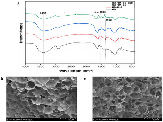 The morphological profile of hydrogels (Gel−PDA+GG+CNC and GG) was analyzed with a scanning electron microscope (Hitachi High−Technologies Corporation, Tokyo, Japan) at 10 kV, and 100 μm resolution photos were taken. Freeze−dried hydrogel pieces were cut by scissors to reveal the proper cross−section. The piece was fixed on a copper board and sprayed with gold [30]. FT−IR analysis was adopted to illustrate the functional groups of the lyophilized Gel−PDA+GG+CNC, Gel−PDA+GG, GG+CNC, and neat GG in the range of 400–4000 cm−1 at a resolution of 4 cm−1 [18].