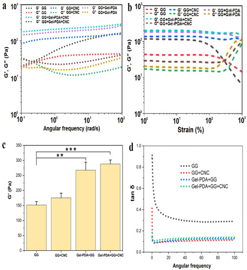 Compared with the GG hydrogel, G′ of GG+CNC, Gel−PDA/GG, and Gel−DA+CNC were clearly higher than G″ across the whole frequency range, implying that these hydrogels possess excellent mechanical properties. The storage modulus of GG hydrogel (152 Pa) was significantly enhanced with the addition of Gel−PDA(267 Pa), while CNC also showed a mechanical reinforcement effect. The highest storage modulus was displayed in Gel−PDA+GG+CNC hydrogel (288 Pa) (Figure 3c). The loss factor, tan δ, is a critical index that determines hydrogel behavior, and it was usually regarded that a lower tan δ reflects a more stable elastomer [13]. In our work, the tan δ of all hydrogel samples was smaller than 1 and weakly frequency dependent, implying a gel−like status. The tan δ of the neat GG hydrogel was 0.29 at the final frequency step, whereas this value was clearly reduced to 0.11 with the CNC (Figure 3d). This result confirmed the critical role of CNC in the stability of GG hydrogel behavior. There was no significant difference in tan δ between GG+CNC, Gel−PDA+GG, and Gel−PDA+GG+CNC hydrogel, implying that they are more stable than GG hydrogel. Especially, Gel−PDA introduction in the GG hydrogel brought the obvious improvement of all rheological indexes, suggesting that Gel−PDA participation in the GG hydrogel is a borate cross−link, not a physical unfolding (because hydrogel preparation was performed at 37 °C). From the strain sweep result, the intersection point of G′ and G″ of GG hydrogel was about 290% of strain (Figure 3b). After this critical strain, G′ of GG hydrogel decreased quickly and started to be lower than G″, meaning that the hydrogel network is damaged and turned into a solution status. With the Gel−PDA and CNC, the intersection did not happen even after 1000% strain, and G′ constantly kept a higher value than G″. This result confirmed the enhancement of mechanical properties of the GG hydrogel by the Gel−PDA and CNC. With regards to the biomedical application of hydrogel, self−healing capacity is also important since many body sites are often subjected to bending, twisting, or other movements, which can easily cause hydrogel damage. Due to the reversible nature of borate cross−linking, GG−based hydrogel showed a fast self−healing capacity [10]. Likewise, GG+CNC, Gel−PDA+GG, and Gel−PDA+GG+CNC hydrogel all exhibited excellent self−healing capacities due to the involvement of Gel−PDA and CNC in the borate−mediated chemistry. For the self−healing test, round−shaped Gel−PDA+GG+CNC hydrogel was cut into two pieces and then put together. After 5 min, the two pieces were reattached and perfectly self−healed without any external stimulus. This reformed piece was stretchable (Figure 4a). Furthermore, the separated two pieces on the finger fully adhered to each other in 10 min when they were brought into contact, and this single piece was not damaged by bending (Figure 4b). Our results confirmed the promising application of hydrogel in the biomedical field for wound healing or biosensors.