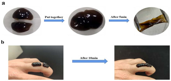 Self−healing test of Gel−PDA+GG+CNC hydrogel. (a) Stretchable self−healed hydrogel, (b) unbreakable self−healing on the finger.