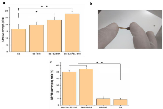 Adhesion and anti−oxidant activity analysis of hydrogels. (a) Skin adhesion strength of hydrogels (* p < 0.05, ** p < 0.01), (b) macroscopic adhesion image of Gel−PDA+GG+CNC hydrogel between fingers, (c) DPPH radical scavenging activity of hydrogels (** p < 0.01).