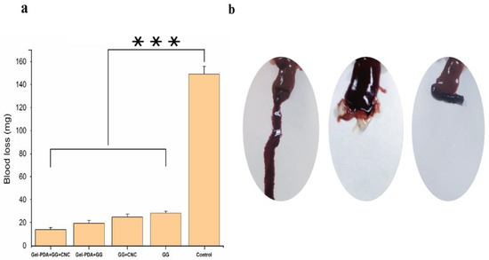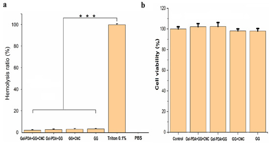Hemostasis is the crucial property of biomedical hydrogel when it is used as wound dressings. With the rapid stop of bleeding, hydrogel dressing can exert good wound closure. The hemostatic capacity of hydrogel was measured using a rat hepatic hemorrhage model. As shown in Figure 6a, compared with the bleeding of 149.33 mg in the control group, GG and GG+CNC hydrogel showed obviously small bleeding (28.4 and 25.16 mg, respectively). Moreover, the blood loss of GG hydrogel was further decreased with the Gel−PDA addition to a great extent (19.56 and 14.16 mg for Gel−PDA+GG and Gel−PDA+GG+CNC, respectively). This result is well−matched with the rheology and adhesion of hydrogels. Previously, it was already reported that good adhesion and mechanical strength enable the hydrogel to adhere to the injury sites quickly to seal the bleeding. Meanwhile, amino groups of Gel−PDA were found to stimulate erythrocyte aggregation. In addition, the vasoconstrictive activity of dopamine is helpful to reduce blood loss because the blood vessels can be constricted rapidly [50]. A hemolysis assay was performed to clarify the possible effect of hydrogels on the red blood cells (RBCs), and there was no significant difference between hydrogel samples (Figure 7a). Considering that the hemolysis ratio limit for biomaterials is below <5%, all hydrogels exhibited good hemocompatibility, suggesting their medical safety.