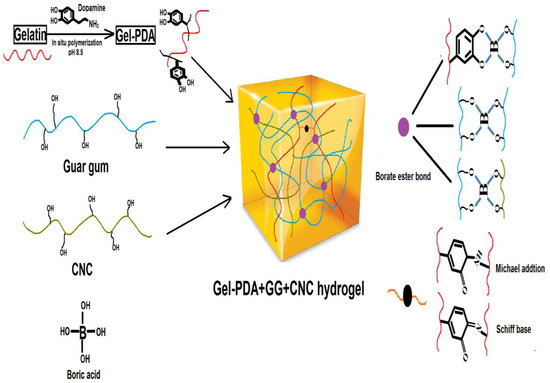 Guar gum (GG) is a natural polysaccharide isolated from the seed of a legume. Its main chain consists of linear 1, 4 linkages of β−D−mannopyranose, while the branch is composed of 1,6 linkages of α−d−galactopyranose. With abundant hydroxyl groups, guar gum has been applied for the facile fabrication of adhesive and stimuli−responsive hydrogels. Among cross−linking chemistry for guar gum−based hydrogel, the borate−didiol interaction was investigated, leading to the promising functional properties [11]. Nonetheless, the instability and weakness of neat guar gum hydrogel restrained its wide application. Actually, borate−based guar gum hydrogel showed a change in mechanical strength between 25 °C and 37 °C, which is a dissatisfying property for wound healing or cell scaffolding [12]. It was known that galactomannan is sensitive to temperature−based degradation [13]. The rheological value of guar guam solutions (storage modulus and loss modulus) decreased with the storage time, which probably means the depolymerization of macromolecules [14]. Moreover, taken with the reversibility of the borate ester bond, guar gum hydrogel still remains unstable with low strength. In this regard, some researchers tried to overcome this defect through the involvement of other polymers, such as chitosan and PAA [15]. Gelatin, a promising natural protein with various reactive functional groups, is renowned for its good gel−forming capacity. However, gelatin hydrogel obtained by unfolding or other physical cross−linking is quickly dissolved and mechanically weak so it cannot meet the practical requirement. Miscellaneous chemistry including a cross−linker (genipin or metal [16]) and grafting (thiol or amino grafting [17,18]) enables the formation of stable, tough, and stimuli−responsive hydrogels from gelatin. Recently, dopamine inspired by mussels has opened many possibilities to design and synthesize the novel hydrogels with excellent functional properties. Catechol groups of dopamine can endow the hydrogel with good tissue adhesion and self−healing ability [19]. Up to date, two major dopamine chemistries have been introduced for the modification of hydrogel precursors. The first chemistry−grafting is normally performed via the covalent bond between polymers and dopamine, and the most representative method is a (dimethylamino) propyl)−3−ethylcarbodiimide hydrochloride (EDC)/N−hydroxysuccinimide (NHS) coupling reaction [20,21]. Dopamine chemistry coating is more facile way to modify the polymer or metal surface [22]. To the best of our knowledge, surfaces including cells and tissues can be decorated with dopamine directly. A catechol of dopamine can be easily transferred into quinones in an alkaline environment (pH > 8.5). Then, it can be sequentially self−polymerized to form a polydopamine on the substrate surface. Similarly, tannic acid coating on the nanocellulose was reported to participate in the tough and adhesive hydrogels [23,24]. However, dopamine coating chemistry has not been extensively investigated for different polymers, and its functional and biological effect still remains unclear. Nanocellulose, such as a cellulose nanocrystal (CNC) and a cellulose nanofiber (CNF), is one of the versatile and sustainable polysaccharides derived from the most abundant resources—cellulose. The good biocompatibility and mechanical property has enabled its wide application for functional hydrogels through a Schiff base reaction, borate−didiol bond, and ionic interaction with other polymers such as PVA, alginate, and gelatin [25,26].