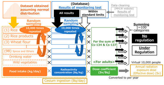 Multiplying the radioactivity concentration and food intake was individually performed for each food category and then summed to obtain the total radiation dose for each virtual person.