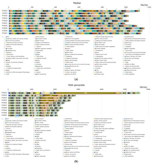 Figure 2 shows the breakdown of the radioactivity concentration of the monitoring test results per food classification. Figure 2a,b illustrate the breakdown in the median and the 95th percentile, respectively. There were no significant differences in the radioactivity concentration of each food classification at the median. The value for other animal meats, including wild boar, was slightly higher, especially in FY 2012. However, at the 95th percentile, there were significant differences in the radioactivity concentrations among food classifications. In FY 2012, the largest classification was other animal meats, followed, in order, by others (in poultries of meats), which includes wild birds, wild vegetables, mushrooms, and other fishes. In the following FY, a similar trend was observed for the top four food classifications (i.e., other animal meats had the highest concentration, followed by others [in poultries of meats], wild vegetables, and mushrooms). However, the concentration values decreased significantly compared with those in FY 2012. As an exception, in FY 2021, the radioactivity concentrations in the 95th percentile of sugars and sweeteners were the highest.