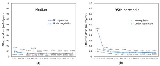 Figure 3 shows the trend of the internal radiation exposure dose of no regulation or under regulation. In addition to the median value in an effective dose of 10,000 virtual persons (Figure 3a), the 95th percentile of a radiation dose (Figure 3b), defined by the ICRP as a radiation dose of a representative person [35], is also shown. In the median and 95th percentile, the effective dose was less than 1 mSv/year in all FYs with no regulation and under regulation. In the median, the radiation dose under regulation was slightly smaller (16.0%) than that of no regulation in FY 2012. Moreover, there were no significant differences (differences were <10%) between no regulation and under regulation in the following years. In the 95th percentile, the effective dose under regulation was more than 10% smaller than that of no regulation from FY 2012 to FY 2015. The difference was significant in FY 2012, as the effective dose under regulation was more than 70% smaller than that of no regulation. After FY 2016, there was no significant difference in the effective dose with no regulation and under regulation—the difference was less than 10%. Overall (no regulation and under regulation, and median and 95th percentile), radiation doses decreased until approximately FY 2016, after which they remained unchanged at low doses.