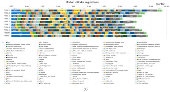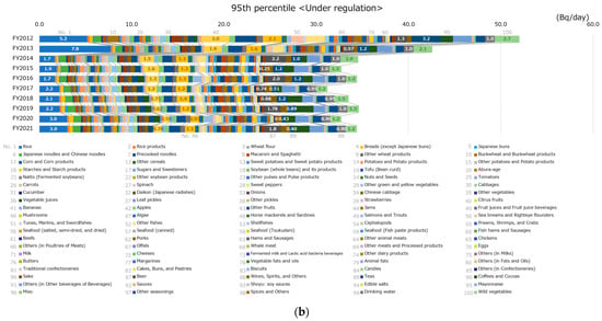 Figure 4 shows the breakdown of cesium ingestion per day under regulation per food classification. The median and 95th percentile values for cesium ingestion of 10,000 virtual persons are shown in Figure 4a,b, respectively. In the median, there was no category with a notably high intake; however, the drinking water intake was high. In some FYs, cesium ingestion was higher in rice, teas, and beer. Similarly, in the 95th percentile, no category had a notably high cesium intake; however, cesium ingestion in rice was moderately high in some FYs. Cesium ingestion (95th percentile) was the largest in FY 2012 and FY 2013, and it decreased in FY 2014, after which there were no significant differences between the years. Even in FY 2012, the year of maximum cesium ingestion, cesium ingestion per day was less than 100 Bq (the standard limit for general foods is 100 Bq/kg).