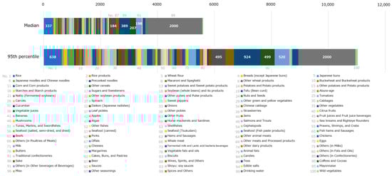 Figure 5 shows the food intake volume for each classification. The value was obtained based on a normal distribution assumed with the average and SD. In the median, the food intake was greater for drinking water, teas, and rice, in that order. In the 95th percentile, the food intake was greater for drinking water, teas, rice, others (in other beverages of beverages), coffees and cocoas, and beer, in that order.