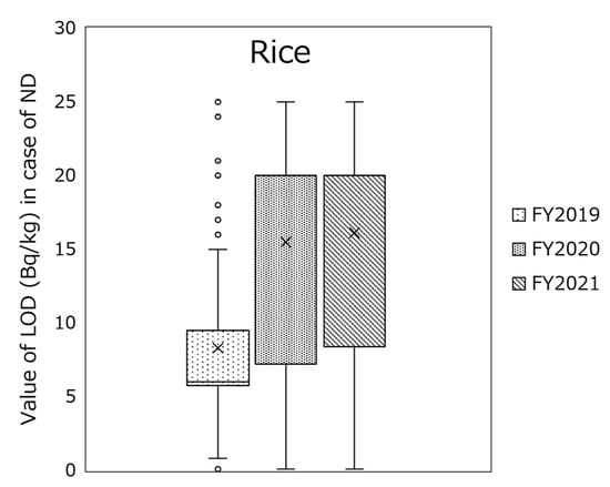 The breakdown of radioactivity concentrations of the monitoring test result per food classification shows no significant differences in each food classification at the median (the concentrations of other animal meats in FY 2012 were slightly higher). However, in the 95th percentile, the activity concentrations in other animal meats, others (in poultries of meats), wild vegetables, mushrooms, and other fishes were higher than in other food classifications in FY 2012. It is widely known that radioactivity levels of foodstuffs that cannot be cultivated or farmed under controlled conditions are sometimes high. The overall radioactivity concentrations have decreased considerably. In recent years, differences in food classification have disappeared, and the effect of the FDNPP accident has decreased. However, in FY 2021, the radioactivity concentrations in the 95th percentile of sugars and sweeteners were the highest. They were traced back to a specific food, i.e., honey, with the highest radioactivity level that exceeded the standard limit of 100 Bq/kg, and it was subject to a voluntary recall [39], indicating that safety measures functioned efficiently. A notable finding was that the rice radioactivity concentrations in FYs 2020 and 2021 at the median were higher than those in the past (Figure 2a). We also analyzed this finding and found that the LOD value was a contributing factor. Figure 6 shows LOD values in the case of ND for rice in FYs 2019–2021, indicating that monitoring tests in FY 2019 were conducted with a small LOD (median: 6.0 Bq/kg) and the tests in FYs 2020 and 2021 were conducted with a large LOD (median for both: 20 Bq/kg). The high concentrations in rice are a result of the more efficient testing process and not because the actual radioactivity concentration in rice has increased (no standard limits were exceeded in either FY2020 or FY2021).