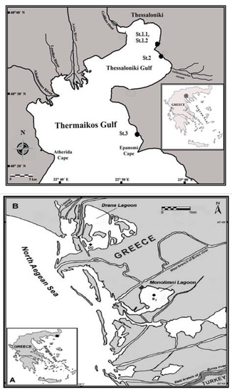 The above map shows Thermaikos Gulf and indicates the sampling stations (i.e., St.1, St.2, St.3). The below maps ((A): whole map of Greece; (B): map of collection region)show Evros Delta and indicate the sampling station (i.e., St.4 Monolimni Lagoon). In above and below maps, the geographical location of the study sites is indicated.
