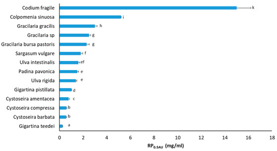RP activity of macroalgae extracts. The RP0.5AU values are presented as the mean ± SD from at least three independent experiments. All RP0.5AU values are statistically significantly (p < 0.05) different compared to controls. Values having different letters are statistically different between them (p < 0.05).
