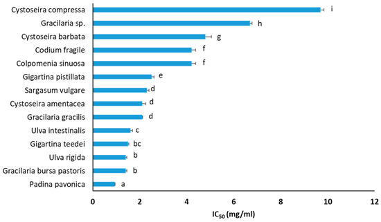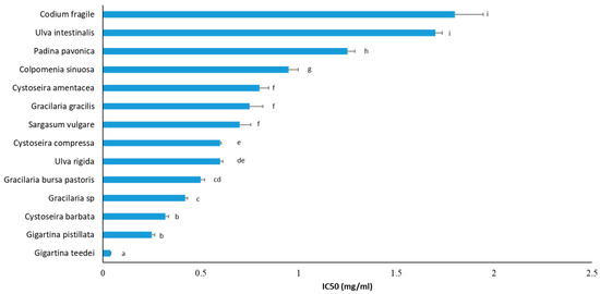 Protection from ROS-induced DNA damage of macroalgae extracts. The IC50 values are presented as the mean ± SD from at least three independent experiments. All IC50 values are statistically significant (p < 0.05) compared to controls. Values having different letters are statistically different between them (p < 0.05).