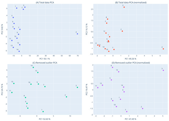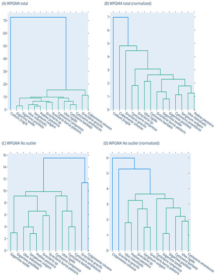In order to identify clusters of closely related macroalgae species, in terms of their overall bioactivities, dendrograms and principal component analysis (PCA) were performed. Clustering was based on seven measures (i.e., DPPH•, ABTS•+, OH•, O2•−, RP, DNA plasmid breakage, and XTT assay for HepG2 cells). Dendrograms were generated using the Euclidian Distance metric and the WPGMA algorithm, with the Scipy python package [47]. PCA was conducted with the scikit-learn package [48] for two components using default parameters. Dendrograms and PCA plots were generated with the plotly Python package (Plotly Technologies Inc., Collaborative data science, Montréal, QC, Canada, 2015. https://plot.ly; accessed on 30 January 2023), for raw as well as normalized data, based on the Z-score transformation. All the above clustering analyses were initially conducted for all fourteen macroalgae. However, after one outlier sample was detected (i.e., C. fragile), all the above analyses were also repeated for the remaining thirteen samples.