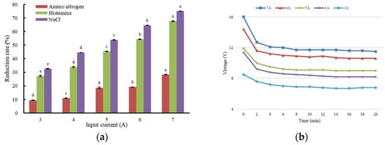 The effect of input current on histamine, ANN, and NaCl reduction rates (a) and ED voltage (b). In panel (a), data were expressed as the reduction rates of their contents before ED. Different letters above the bars indicate significant differences among treatments (p < 0.05).