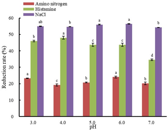 The effect of pH on histamine, ANN, and NaCl reduction rates. Data were expressed as the reduction rates of their contents before ED. Different letters above the bars indicate significant differences among treatments (p < 0.05).