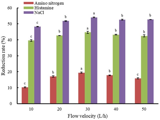 Changes in histamine removal, ANN loss, and NaCl reduction rates of fish sauce after ED at various flow velocities were shown in Figure 4. The results showed that all of them increased first and then decreased with the increasing flow velocity. The higher amino acid fluxes could decrease the current efficiency, resulting in a lower amino acid loss rate []. The histamine removal rate reached a maximum value of 44.67% at the flow velocity of 30 L∙h−1, and the ANN loss rate reached a maximum value of 19.42% at the flow velocity of 30 L∙h−1. In addition, the NaCl reduction was stable and kept at a rate above 53% at a flow velocity higher than 20 L∙h−1.