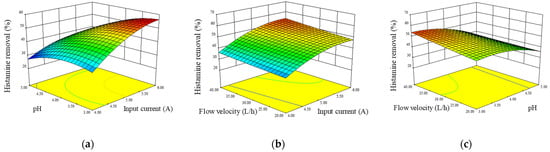 Response surface plots showing the interaction effects of input current and pH at a constant flow velocity of 30 L/h (a), input current and flow velocity at a constant pH value of 4.0 (b), and pH value and flow velocity at a constant input current of 5 A (c) on histamine removal. The change in color from blue to red indicates the reduction of histamine from less to more, and higher slopes result from greater changes.