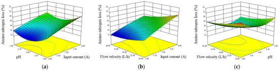 Response surface plots showing the interaction effect of input current and pH at a constant flow velocity of 30 L/h (a), input current and flow velocity at a constant pH value of 4 (b), and pH value and flow velocity at a constant input current of 5 A (c) on ANN loss. The change in color from blue to red indicates the loss of amino nitrogen from less to more, and higher slopes result from greater changes.ANOVA showed that X1X2 was significant (p < 0.05) for histamine removal rate, whereas for ANN loss rate, no significant cross-product was found (p > 0.05). As seen in Figure 5a, the histamine removal rate increased slightly with an increase in pH at a low constant current. However, when the current increased, the surface increased more densely with the decrease in pH value, which means that the function of pH value on histamine removal rate increased. This phenomenon might be because higher input currents lead to higher histamine molecule transport rates, while lower pH values resulted in more charged histamine ions.