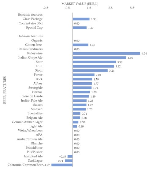 Lastly, a discount price of −3.81% (−0.48 EUR/L) was found for Irish Red Ale brewery style, −5.72% (−0.71 EUR/L) for Dark Lager, and −15.74% (−1.97 EUR/L) for the California Common beer styles. A potential explanation for the price discount associated with these beers could be related to their color: red and dark for the first two styles, respectively, and ranging from medium amber to light copper color for the California Common [50]. Studies pointed out as beer color is a good predictor of consumer interest, though in a different manner depending on the cultural context. According to Donadini et al. (2016) [54], in the Italian market (the same market object of this study) dark and red-colored beers are less preferred compared to gold-colored ones. In detail, the authors found that Italians like less dark-colored beers than light ones, instead gold-colored beer positively affects consumer interest to buy and willingness to pay which is twice that recorded for beers having a red color.
