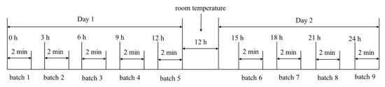 Frying experiments were performed in a DF-6L deep-fryer (Jieguan Co., Ltd., Dongguan, China). For the frying trials, two frying pots were used, each with 6 L of high-oleic sunflower oil. One pot was used for the fried shrimp group, while the other was used for the control (no shrimp were added and the oil was heated at a constant temperature). The temperature was controlled using an infrared temperature device (Xima Co., Ltd., Zhaoqing, China) and heated to 180 ± 5 °C within 10 min. In order to maintain stable quality and heat transfer efficiency, the solid-to-liquid ratio was adjusted to 1:15 (kg:L); the details are shown in Table 1. A batch of pretreated shrimp was fried for 2 min every 3 h, 150 mL oil was sampled from both pots before and after each batch, and no fresh oil was added to the fryer. We used one frying pot to fry three times. The samples were stored at −80 °C for further analysis. The specific frying process is shown in Figure 1.