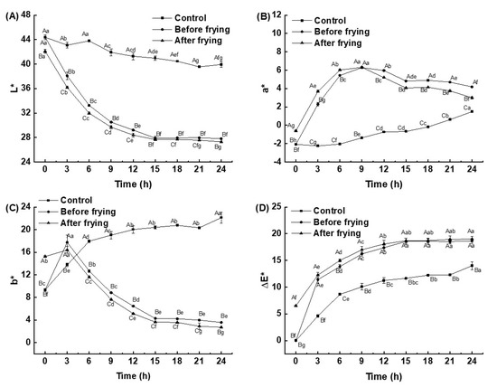 Changes in L* values (A), a* values (B), b* values (C), and ΔE* values (D) of high-oleic sunflower oil after different frying times. Note: Different lowercase letters indicated that there were significant differences among the samples prepared with the same deep-frying treatment and different frying times (p < 0.05), and different capital letters indicated that there were significant differences among the samples prepared with the same deep-frying time and different deep-frying treatments (p < 0.05).