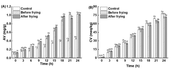 Changes in acid values (AVs) (A) and carbonyl values (CVs) (B) of high-oleic sunflower oil after different frying times. Note: Different lowercase letters indicated that there were significant differences among the samples prepared with the same deep-frying treatment and different frying times (p < 0.05), and different capital letters indicated that there were significant differences among the samples prepared with the same deep-frying time and different deep-frying treatments (p < 0.05).