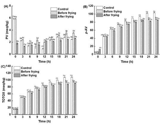 Changes in peroxide values (PVs) (A), p-anisidine values (p-AVs) (B), and total oxidation (TOTOX) values (C) of high-oleic sunflower oil at different frying times. Note: Different lowercase letters indicated that there were significant differences among the samples prepared with the same deep-frying treatment and different frying times (p < 0.05), and different capital letters indicated that there were significant differences among the samples prepared with the same deep-frying time and different deep-frying treatments (p < 0.05).