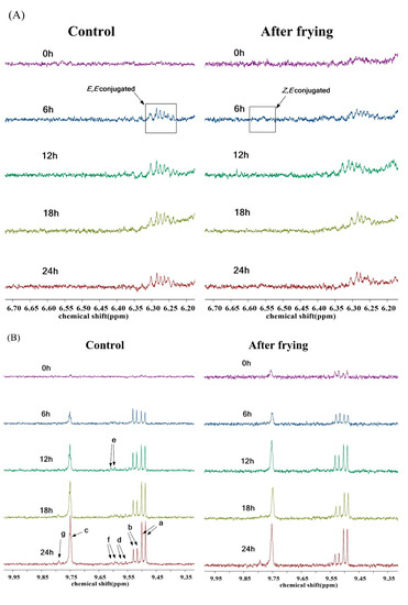 The first oxidation process occurred during the frying process, producing lipid hydroperoxides such as Z,E-conjugated and E,E-conjugated hydroperoxides. E,E-conjugated hydroperoxides have chemical shifts between 6.2 and 6.3 ppm, whereas Z,E-conjugated hydroperoxides have chemical shifts between 6.5 and 6.6 ppm [41]. The 1H NMR spectra of the control and frying groups during the primary oxidation of high-oleic sunflower oil are shown in Figure 5A. Their contents were calculated based on the NMR spectra and the results are shown in Table 3. The concentration of E,E-conjugated hydroperoxides increased slowly with frying, and no Z,E-conjugated hydroperoxides were generated in the control. Z,E-conjugated hydroperoxides were generated only after 12 h in the frying group, with no significant difference in the intensity in the subsequent frying process. This may be because the trans molecular structure has a higher bond energy and higher threshold of formation than that of cis molecules [42], so the Z,E-conjugated hydroperoxide content was lower than the content of E,E-conjugated hydroperoxides. After frying L. vannamei shrimp in high-oleic sunflower oil, the major oxidation products exhibited an increasing tendency. During the frying process, lipid hydroperoxides subjected to high temperatures easily enter the secondary oxidation process, further oxidizing to generate aldehydes, ketones, acids, esters, and short-chain carbonyl compounds [43], which are in the range of 9.5–9.8 ppm in the NMR spectrum. It was observed that a bimodal signal was produced by (E)-2-alkenals at around 9.50 ppm in the generated compounds (Figure 5(Ba)) and a bimodal signal was generated by (E,E)-2,4-alkadienals at around 9.52 ppm (Figure 5(Bb)). The (E)-2-alkenals and (E,E)-2,4-alkadienals partially overlapped [44]. In addition, the secondary oxidation process produced 4-hydroxy-(E)-2-alkenals (Figure 5(Bd)) and 4-hydroperoxy-(E)-2-alkenals (Figure 5(Be)), which partially overlapped and therefore co-integrated both compounds in the NMR integration. Furthermore, there were 4,5-epoxy-(E)-2-enal (Figure 5(Bf)), 4-oxoalkanes (Figure 5(Bg)), and n-alkanes (Figure 5(Bc)). The contents of the secondary oxidation products were calculated from their NMR spectra, as shown in Table 3. It can be seen that the secondary oxidation products showed an increasing trend during frying, while the deep-fried shrimp group showed a faster increase and accumulated more secondary oxidation products than the control, possibly because L. vannamei shrimp contain a large percentage of n-3 LC-PUFA which may be released into the oil, making it more susceptible to oxidation and increasing oxidation products [45].