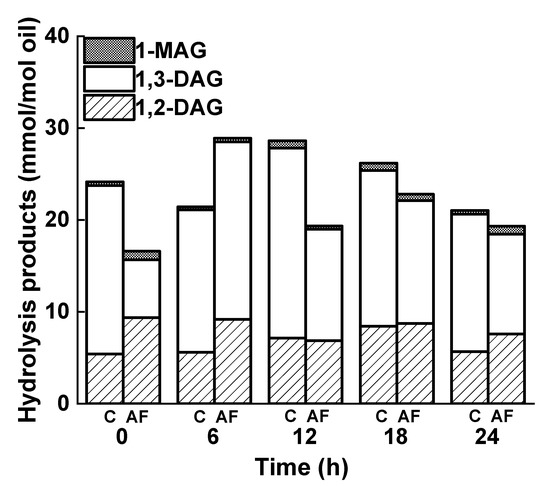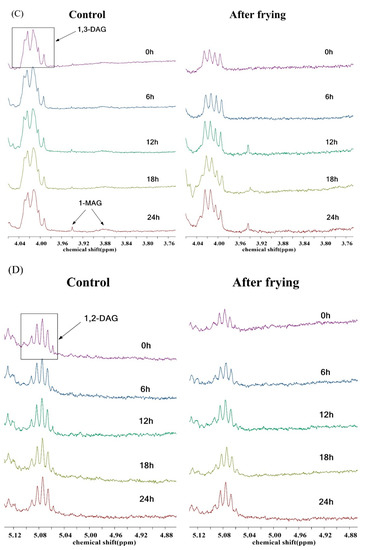During frying, hydrolysis products such as 1,2-DAG, 1,3-DAG, and 1-MAG were also generated (Figure 5C,D) [46,47]. As shown in Figure 6, the quantities of hydrolysis products in the control and deep-fried groups was concentrated in the range of 15–30 mmol/mol oil and reached their maxima at 6–12 h, indicating that the breakage of ester bonds was the most intense at this time [48]. It was also discovered that the hydrolysis products were only minor products of the frying process [49,50]. Furthermore, the majority of the polar components in the frying oil were formed through the oil’s oxidation and polymerization, and these polar compounds were more hazardous than those produced via hydrolysis.