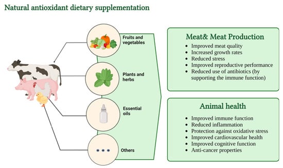 - Ponnampalam, E.N.; Kiani, A.; Santhiravel, S.; Holman, B.W.B.; Lauridsen, C.; Dunshea, F.R. The Importance of Dietary Antioxidants on Oxidative Stress, Meat and Milk Production, and Their Preservative Aspects in Farm Animals: Antioxidant Action, Animal Health, and Product Quality—Invited Review. Animals 2022, 12, 3279. [Google Scholar] [CrossRef] [PubMed]