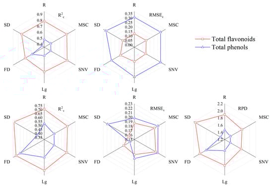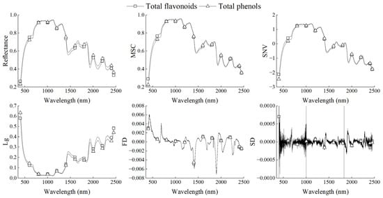 In this study, two samples close to the average content of total flavonoids and total phenols in two data sets were taken as examples to analyze the changes in the original spectrum and its transformation spectra. It can be seen from the Figure 1 that the change trends of the original spectral reflectance of the two samples are basically the same. Both of them basically showed a trend of increase first and then decrease with the increase in wavelength, and both of them formed multiple reflection peaks and absorption valleys. Among the five transformation spectra, except MSC, the other four algorithms all had a great change effect on the original spectrum. The SNV algorithm did not change the overall change trend of the original spectral curve but changed the value of spectral reflectance. The change trend of the Lg spectrum was opposite to that of the original spectral curve. The values of the FD and SD spectra were mainly positive and negative alternately, and the changes in the SD spectrum were more frequent. These two algorithms made the original spectrum lose all its original spectral features. However, MSC transformation had no visible difference from the original spectral reflectance. It can be seen that different preprocessing algorithms had different effects on the changes in the original spectral curve.