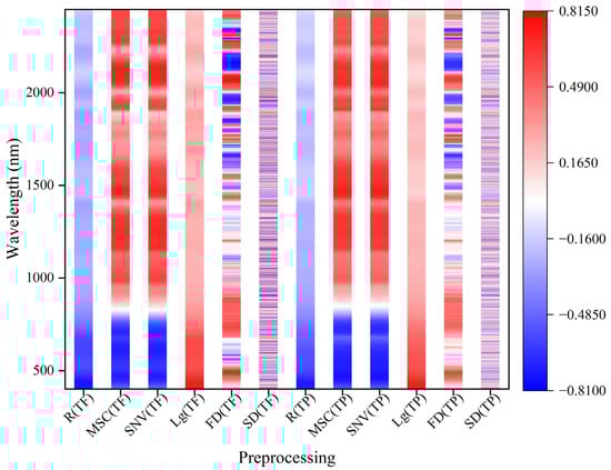 Figure 2 shows the correlation between the original spectrum and different transformation spectra and the content of total flavonoids and total phenols in grains. The correlation of total flavonoids content and total phenols content with the same transformation spectrum was basically similar, but there were also some differences. The total flavonoids content and total phenols content were negatively correlated with the original spectrum, but positively correlated with the Lg spectrum. The two indicators were mainly negatively correlated with MSC and SNV spectra in the range of 401–800 nm, while they were mainly positively correlated in the range of 800–2450 nm. The correlation between the two indicators and FD and SD spectra was mainly positive and negative correlation alternating in the continuous band range, and the alternating phenomenon of the SD spectrum was more obvious. In addition, compared with the original spectrum, the correlation between the total flavonoids content and total phenols content and the transformation spectra was improved to a certain extent.